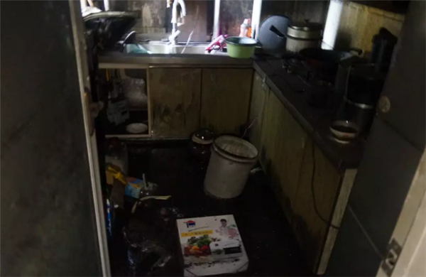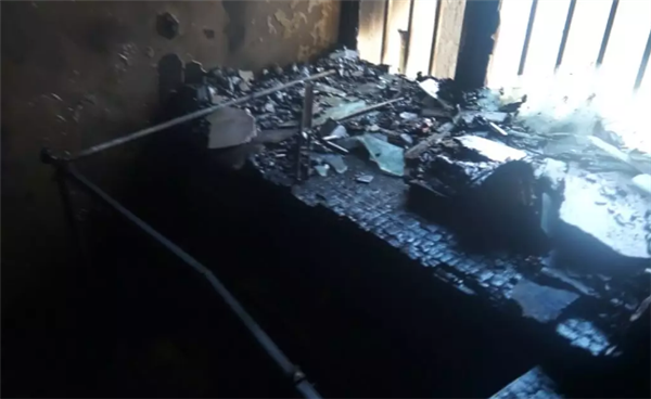 除了客厅,还有一间卧室内的墙壁、橱柜、被褥等也被大火“熏黑”。