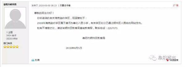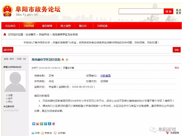 近日,有网友在阜阳市政务论坛发帖咨询海亮御府学区问题:阜阳市教育局      1、已获悉颍州区教育局已把2018年中小学学区已公布于众,但怎么也找不到我们海亮御