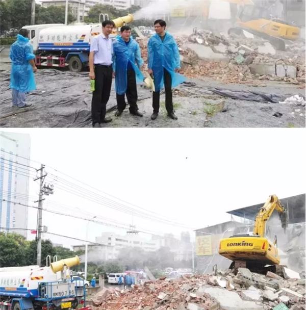 昨日雨中!颍州区城管执法局配合鼓楼办事处对辖区内教门庄违法建设进行强力拆除!此次共动用执法人员、办事处及社区工作人员200余人,出动执法车辆30台次,挖掘机2台,抑尘设备两台。至目前为止,共拆除违法建